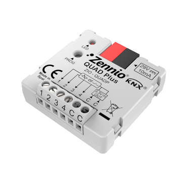 Analog/digital sensor. QUAD Plus is an analog/digital sensor that offers a large variety of functionality. Its 4 optocoupled multi-function inputs may be configured as digital inputs for sensors and potential-free push buttons, as temperature probes or as a motion sensor. Four room thermostats for heating/cooling control systems included. Accessories: Temperature probes and motion sensor.